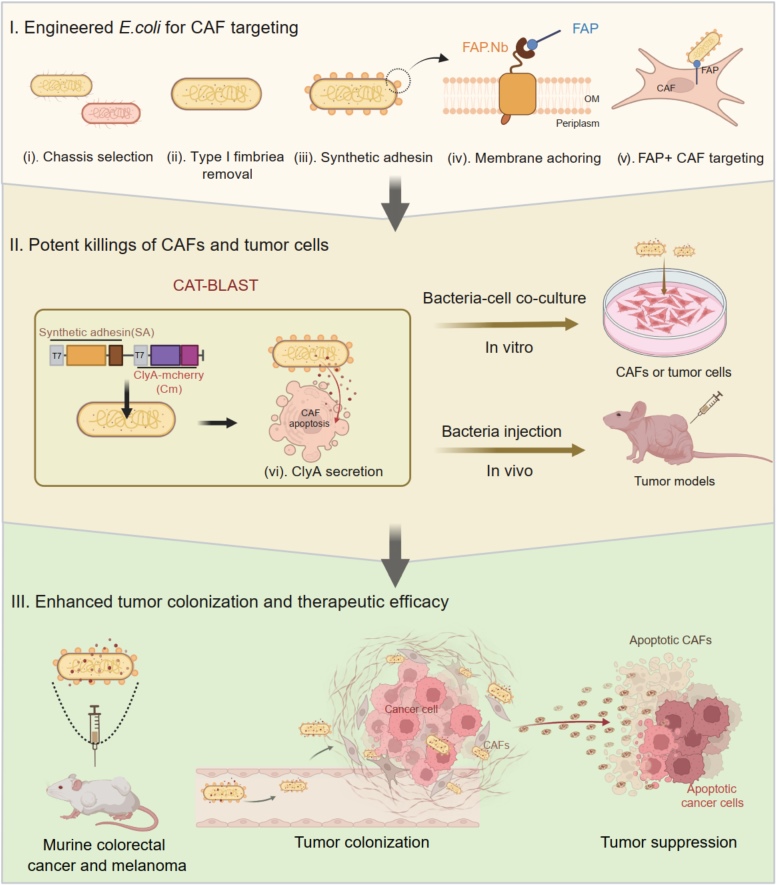 Cancer-associated fibroblasts (CAFs) construct a protective stromal barrier that promotes tumor growth and resistance to therapy. To dismantle this, we developed CAT-BLAST, an engineered bacterial platform designed to potently eliminate these cells. We engineered a safe, high-expression E. coli chassis, arming it with a FAP-specific synthetic adhesin for precise CAF targeting and the ability to secrete the ClyA cytotoxin to induce apoptosis in both CAFs and adjacent tumor cells. This platform demonstrated robust, FAP-specific targeting across diverse human tumor xenograft models and achieved significant tumor suppression in both murine colorectal cancer and melanoma.