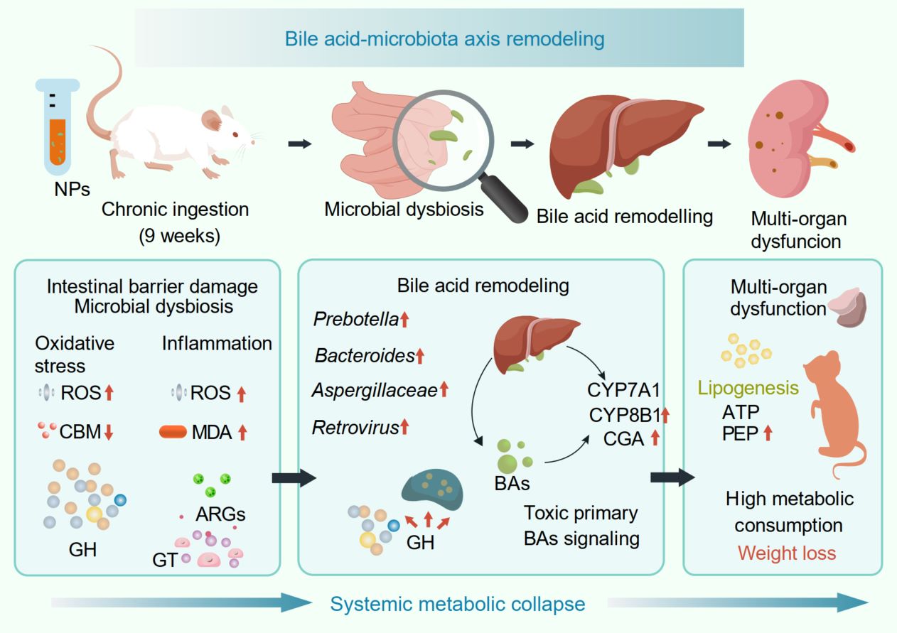 The pervasiveness of microplastic pollution poses a growing health risk, yet its long-term metabolic consequences remain poorly defined. Here, we exposed mice to polyethylene terephthalate nanoparticle (NP) and combined histopathology, biochemistry, metabolomics, and metagenomics to resolve their interactions. NP ingestion induced a severe systemic phenotype characterized by weight loss, organ atrophy, dyslipidemia, and gut barrier collapse. Mechanistically, NPs disrupted bile acid (BA) homeostasis by hyperactivating hepatic synthesis pathways while suppressing microbial 7α-dehydroxylation. This accumulation of cytotoxic BAs drove hepatic lipogenesis and aggravated mucosal inflammation. Crucially, metagenomics uncovered significant gut microbiota dysbiosis, where the enrichment of bile salt hydrolase-encoding taxa and depletion of 7α-dehydroxylating clades reinforced this BA imbalance. Furthermore, the microbiota exhibited functional deterioration, shifting toward glycan degradation with a concurrent loss of antibiotic resistance genes, signaling reduced ecological resilience. These findings identify BA dysregulation and specific microbiota functional losses as primary drivers of NP-induced systemic metabolic collapse.