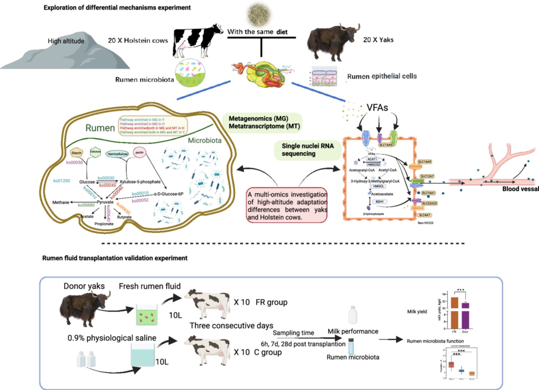 This study is the first to elucidate mechanisms of high-altitude adaptation from the perspective of the rumen ecosystem by using indigenous yaks and Holstein cows that have lived at high altitude since birth as comparative models. Through a systematic comparison of their rumen ecology using multi-omics approaches—including rumen metagenomics, metatranscriptomics, and single-nucleus transcriptomics—we identified distinct adaptive strategies employed by the two species under extreme plateau environments. Specifically, the rumen microbiota of yaks was enriched in central carbon metabolism pathways, whereas the microbiota of Holstein cows was enriched in pathways related to the degradation of specific complex carbohydrates. Concurrently, yak rumen epithelial cells exhibited increased expression of genes associated with ketone body metabolism, along with higher pathway activity scores for ketone body biosynthesis and fatty acid beta-oxidation. Moreover, we introduced rumen fluid transplantation from yaks for the first time and observed that, under the conditions of this study, yak microbiota transplantation increased milk yield in Holstein cows. After transplantation, the carbon metabolism of the rumen microbiota gradually declined, further confirming the key role of the rumen microbiota in regulating host energy supply in the context of yak high-altitude adaptation. Overall, this study deciphers the mechanisms by which gastrointestinal microbiota contributes to high-altitude adaptation in ruminants and provides a new perspective for addressing challenges related to adaptation to high-altitude environments.