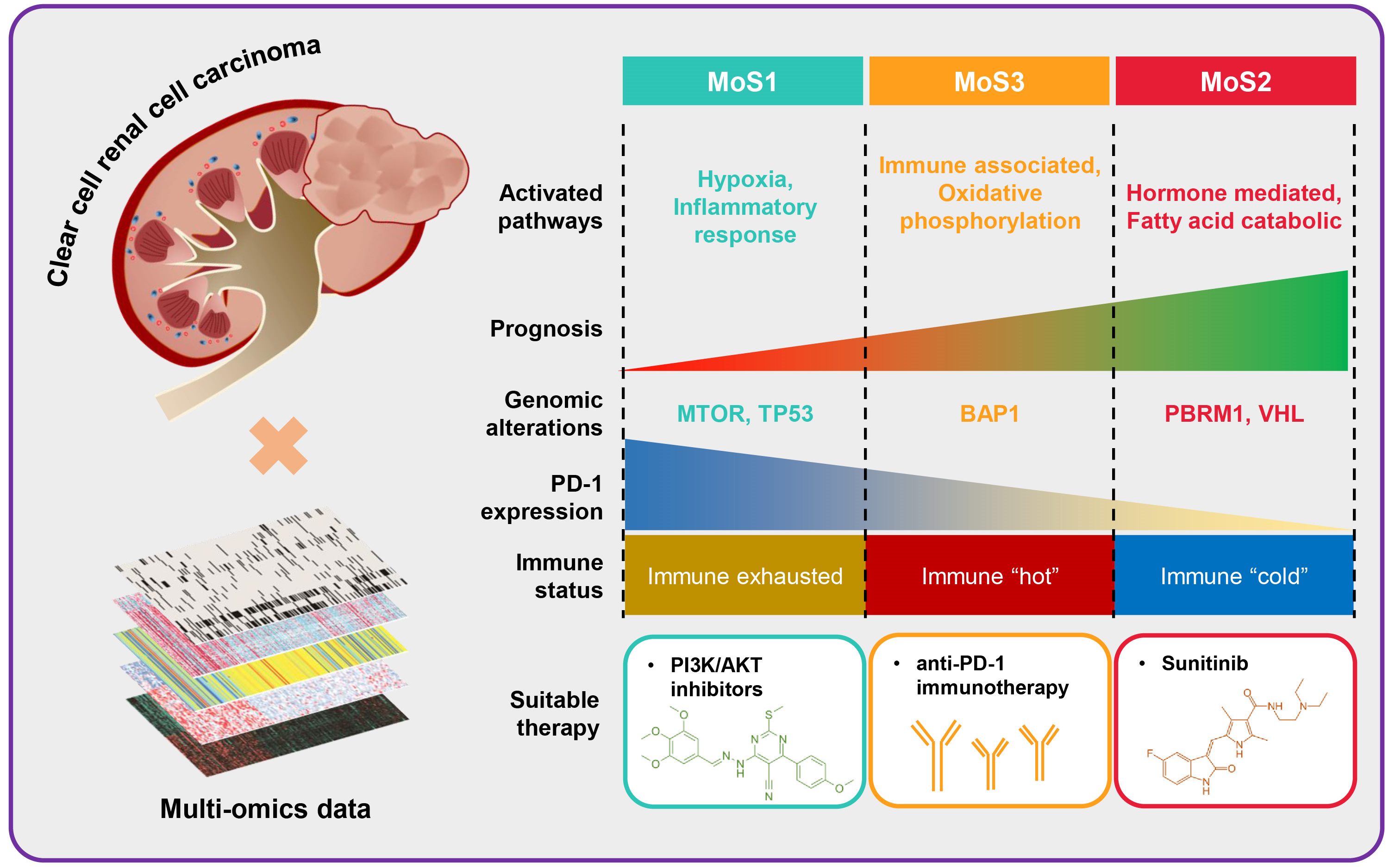 We established a novel molecular classification for ccRCC via multiomics features, named multiomics subtype (MoS). MoS correlates with significantly different clinicopathological parameters, molecular alterations, signaling activation, immunocyte infiltration, and therapeutic response. MoS1 subtype, presented the poorest prognosis, and might be caused by an exhausted immune microenvironment, activated hypoxia features, but can benefit from PI3K/AKT inhibitors. MoS2 subtype represented more mutations of VHL and PBRM1, favorable prognosis and is more suitable for sunitinib therapy. MoS3 is the immune “hot” subtype, and can benefit from the anti-PD-1 immunotherapy. We also confirm that SETD2 is a tumor suppressor in ccRCC, along with the decreased SETD2 protein level in advanced tumor stage, and knock-down of SETD2 leads to the promotion of cell proliferation, migration, and invasion.