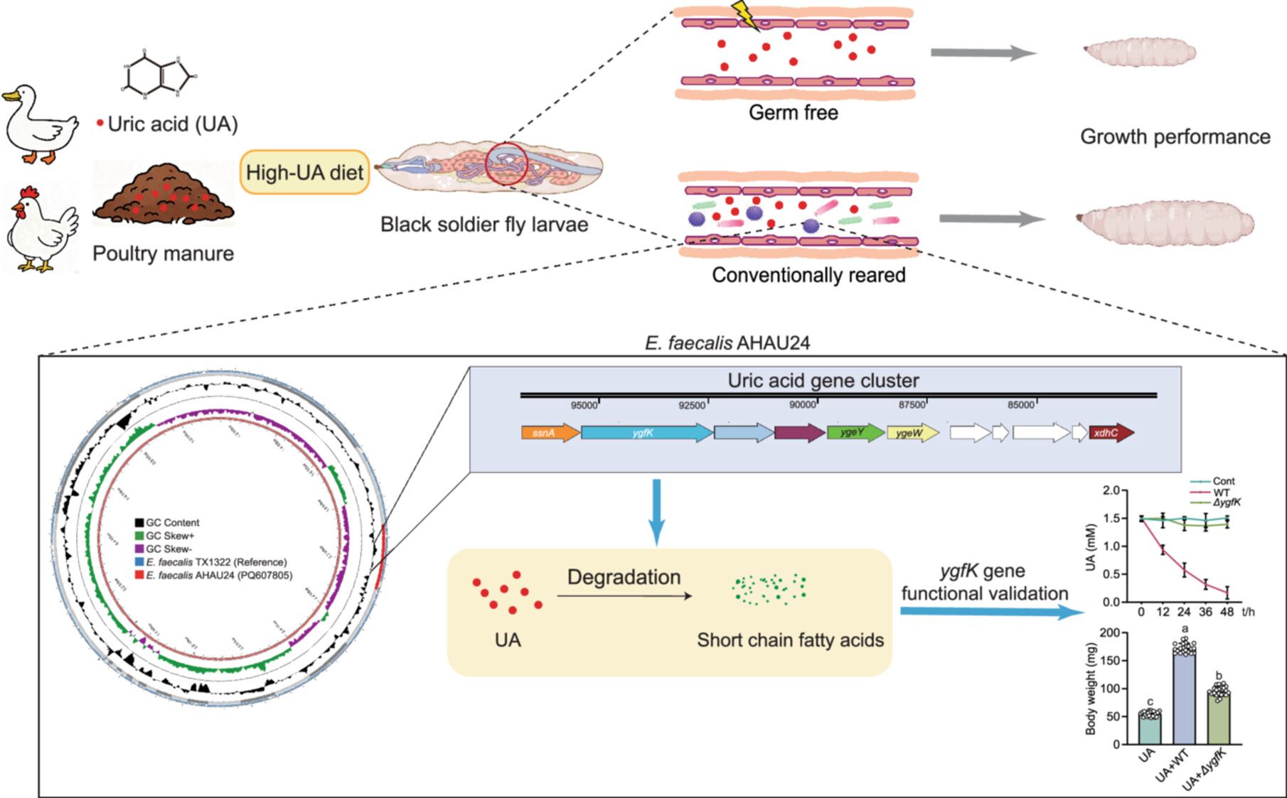 This study demonstrates the detrimental effects of exogenous uric acid (UA) on the growth of black soldier fly (BSF) larvae, highlighting the role of gut microbiota in UA degradation. We isolated UA-degrading bacterial strains associated with BSF, including Enterococcus faecalis AHAU24. Genomic analysis identified a UA degradation gene cluster in this strain, providing insights into its potential for UA catabolism. Furthermore, mono-association of germ-free larvae with E. faecalis AHAU24 confirmed that this strain alleviates UA-induced growth retardation and enhances bioconversion efficiency by degrading dietary UA.