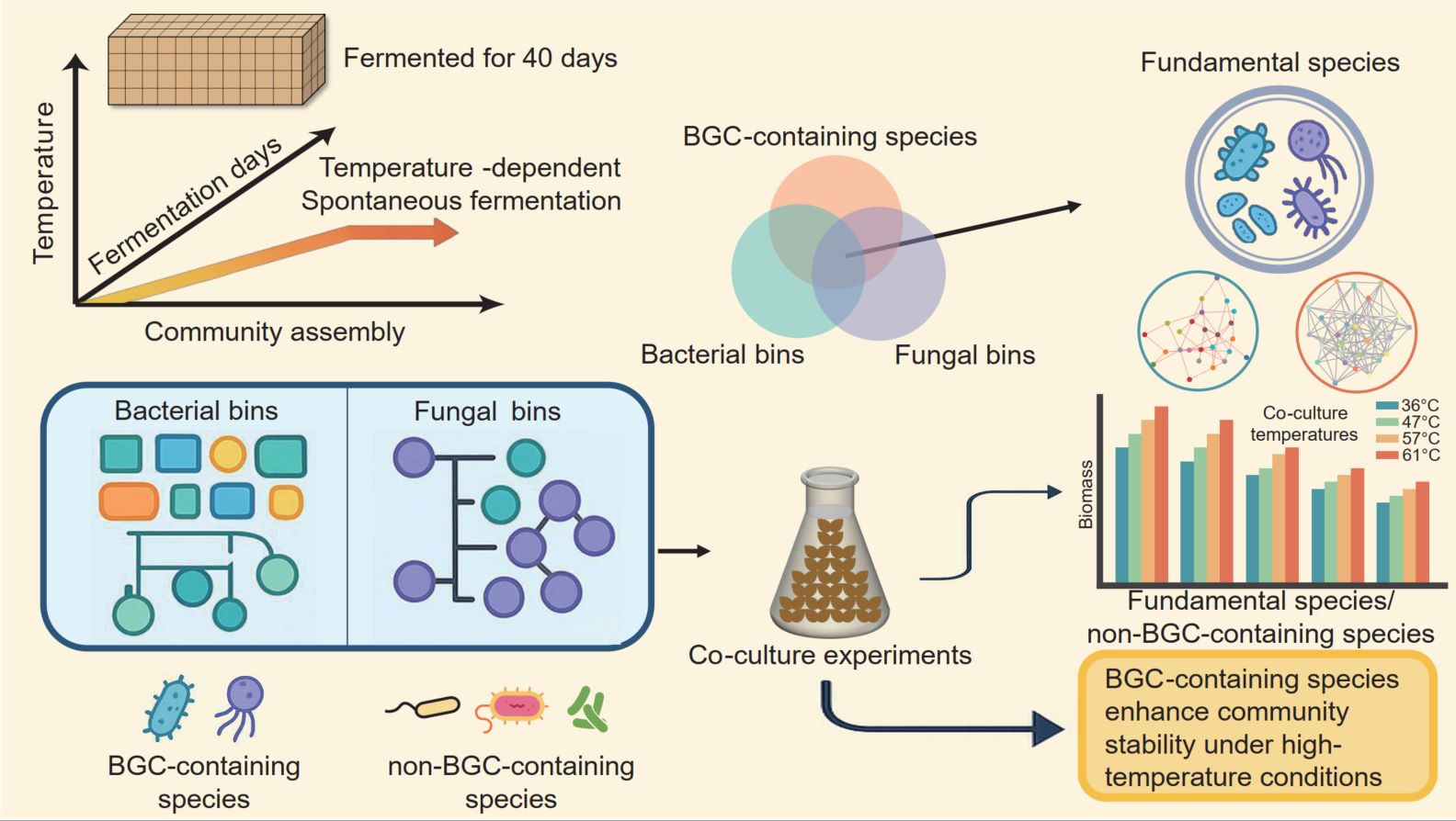 The study framework for exploring microbial community assembly and community stability of biosynthesis gene cluster (BGC)-containing species under thermal stress (20°C–65°C) during 39 days of spontaneous fermentation. Temperature gradients during spontaneous fermentation reshape microbial community assembly, driving pronounced succession in both bacterial and fungal communities. Community assembly is jointly governed by deterministic and stochastic processes, with bacterial heterogeneity selection and dispersal limitation showing strong associations with thermal stress, while fungal assembly is primarily linked to homogeneity selection and drift. In parallel, BGC-containing species are enriched at high temperatures and are associated with higher community cohesion and stability-related network properties under thermal stress. Removal simulations identified key fundamental species, indicating their importance for community resilience, while co-culture experiments demonstrated that BGC-containing species significantly increased biomass under thermal stress. These results underscore the critical role of BGC species in promoting stability and resilience.