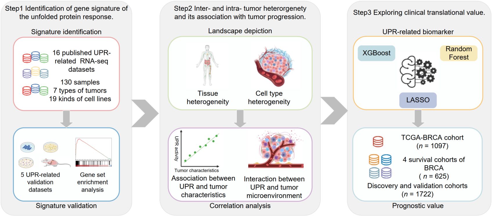 Schematic of the study design. In this study, we developed a comprehensive unfolded protein response (UPR) gene signature and applied it to systematically characterize the UPR landscape across multiple cancer types. By integrating bulk and single-cell transcriptomic data, we revealed substantial inter- and intra-tumoral heterogeneity in UPR activity and uncovered critical associations between UPR and key cancer features, including genomic features and immune responses. Importantly, we further employed machine learning methods to construct a simple three-gene prognostic model derived from the UPR signature, which can effectively predict overall survival of breast cancer patients, highlighting both the role of UPR in modulating tumor immunity and the clinical utility of the UPR gene signature in cancer prognosis and precision medicine.