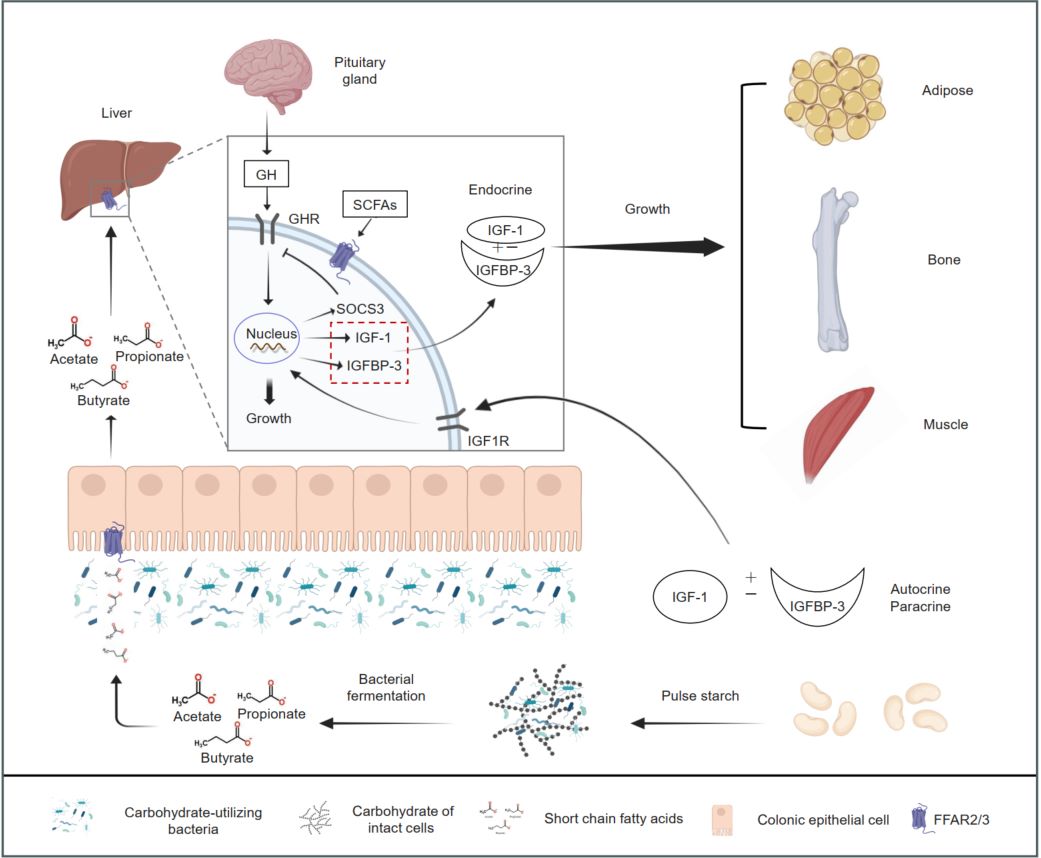 The MAL-IC diet promotes growth in malnourished mice by regulating the gut microbiota—increasing the abundance of carbohydrate-utilizing bacteria and SCFAs production. SCFAs circulate to the liver via the gut–liver axis, where they bind FFAR2 and activate the somatotropic axis, thereby stimulating GHR-mediated GH signaling and increasing IGF-1 and IGFBP-3 production, ultimately promoting systemic growth.