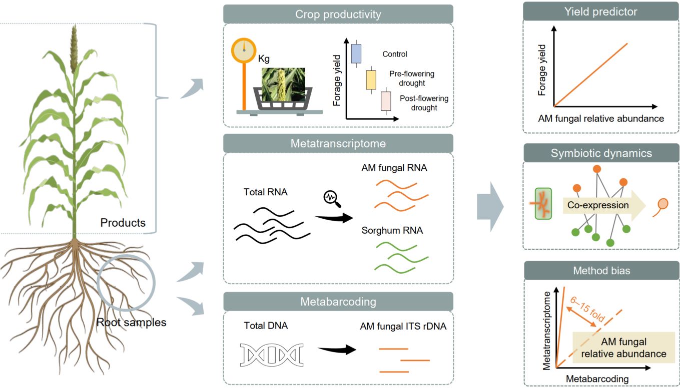 Paradigm shift: PCR-free methods reveal 6–15-fold higher arbuscular mycorrhizal (AM) fungal abundance than metabarcoding, exposing systematic underestimation across decades of research. Predictive power: AM fungal abundance serves as a community-level trait that predicts crop yield under drought conditions. Symbiotic dynamics: Symbiotic life history from arbuscule formation to sporulation is governed by coupled and decoupled co-expression of plant and AM fungal genes.