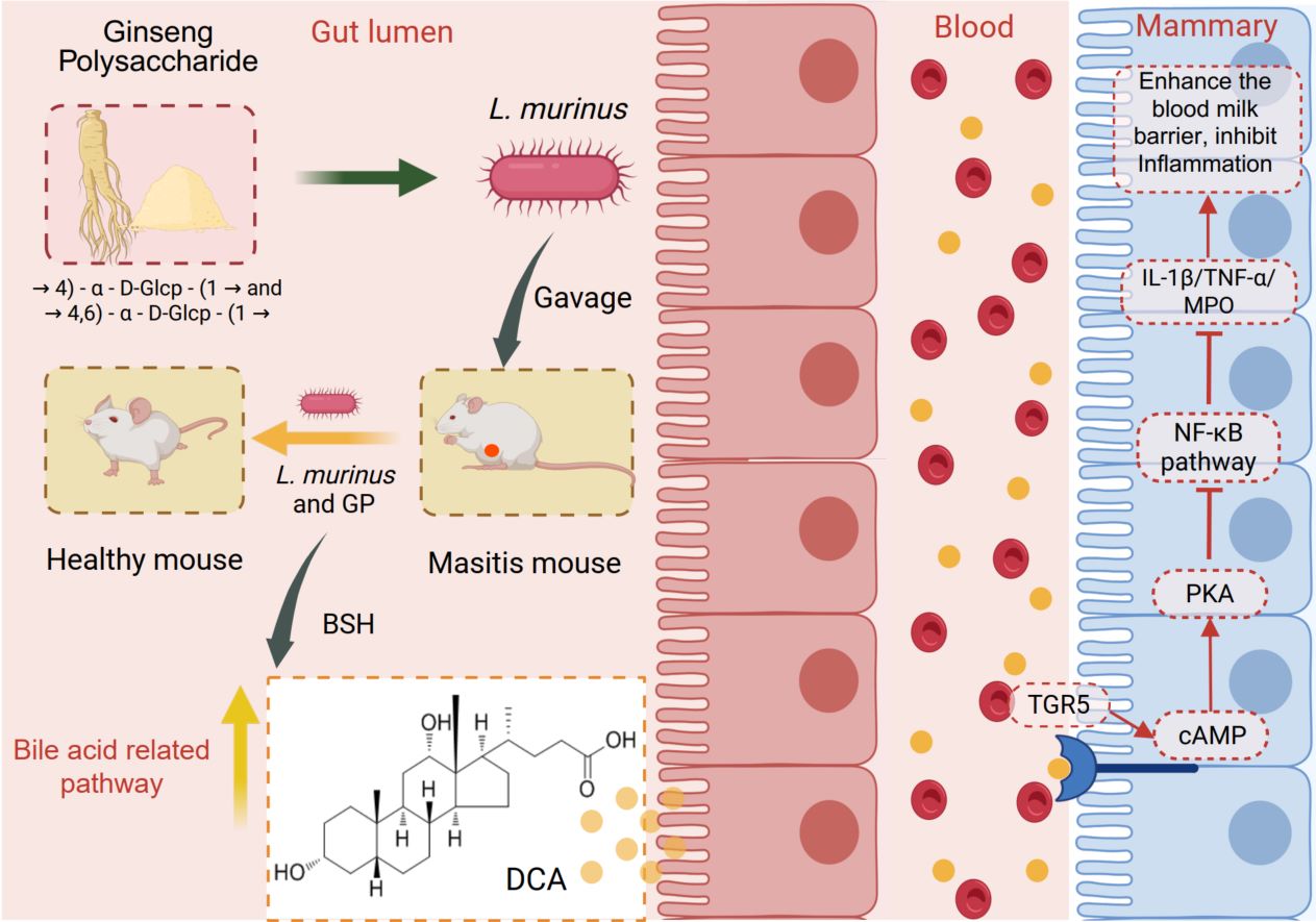 Prebiotic Ginseng polysaccharides (GP) alleviate mastitis through selective enrichment of gut L. murinus, which elevates its anti-inflammatory metabolite deoxycholic acid (DCA). Circulating DCA engages mammary epithelial TGR5 receptors, triggering the cAMP–PKA pathway to suppress NF-κB/NLRP3-mediated inflammation. The synergistic action of GP and L. murinus underscores the translational promise of this synbiotic strategy. Targeting the gut–mammary axis—specifically the identified microbial (L. murinus) and metabolic circuits—offers a compelling, non-antibiotic approach for mastitis prevention and therapy.