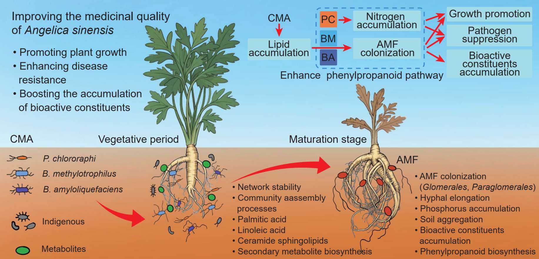 Functionally complementary bacterial inoculant coordinates arbuscular mycorrhizal fungi to improve Angelica sinensis root yield and quality