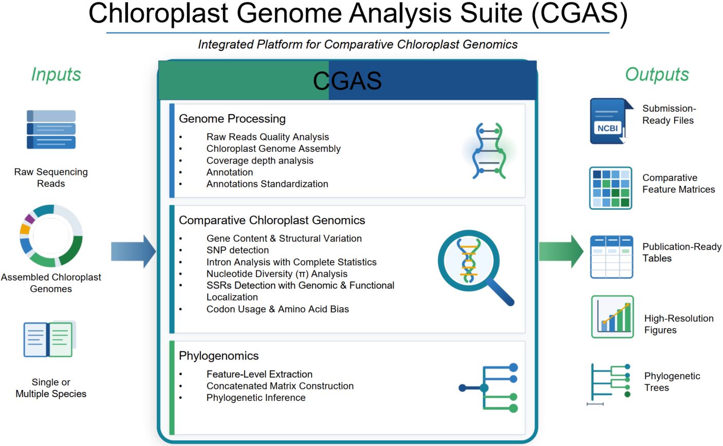 Chloroplast Genome Analysis Suite (CGAS) is a comprehensive bioinformatics pipeline that streamline chloroplast genome analysis from raw sequencing reads to publication-ready outputs. The suite integrates 14 specialized modules organized across three sequential phases. Phase 1 (Modules 1–4) handles genome assembly, quality control, annotation, gene normalization, and National Center for Biotechnology Information-format conversion using tools such as fastp, GetOrganelle, PGA, and others. Phase 2 (Modules 5–13) enables batch comparative genomics, encompassing gene content comparison, genome structure characterization, codon usage analysis, amino acid composition, single-nucleotide polymorphism detection, intron profiling, simple sequence repeat identification, and nucleotide diversity assessment—with R-based visualizations integrated where graphical representation of results is required. Phase 3 (Module 14) performs robust phylogenetic inference via alignment and tree-building programs, including MAFFT, MACSE, IQ-TREE, and others. Together, CGAS transforms raw chloroplast genome data into comparative insights, providing researchers with an automated, reproducible, and scalable solution for comparative chloroplast genomics, available at https://github.com/abdullah30/Chloroplast-Genome-Analysis-Suite-CGAS.