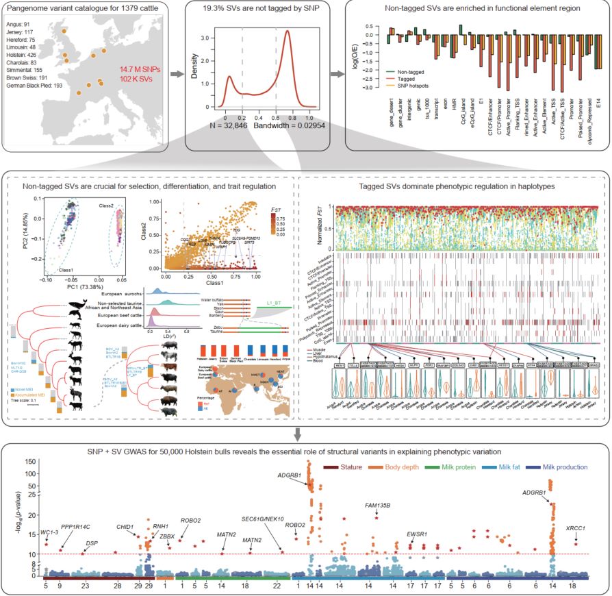 This study built a pan-genome single-nucleotide polymorphism (SNP) + structural variations (SVs) map for 1379 European cattle. It revealed that SVs not tagged by SNPs are crucial for selection, differentiation, and trait regulation, whereas SNP-tagged SVs dominate phenotypic regulation within haplotypes, collectively proving SVs' essential role in explaining phenotypic variation.