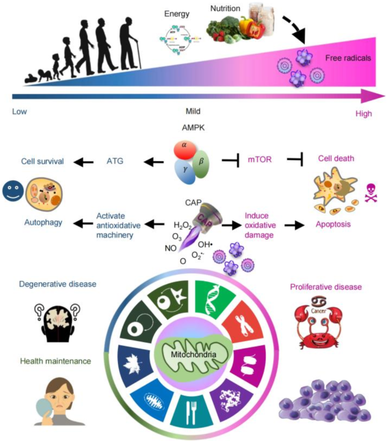 Free radicals play a dual, dose-dependent role in aging. Low levels activate the key sensor adenosine 5'-monophosphate-activated protein kinase (AMPK), promoting cell survival mechanisms like autophagy and enhancing mitochondrial health. High levels, however, push AMPK to initiate cell death pathways, such as apoptosis. This positions AMPK as a central nexus linking free radical signaling to mitochondrial function and aging outcomes. Based on this principle, cold atmospheric plasma (CAP), as a controllable source of reactive species including free radicals, offers therapeutic potential. Lower doses can support health and treat degenerative diseases by boosting cellular resilience and survival. Conversely, higher doses can be applied to eliminate malignant cells, making CAP a promising tool against proliferative diseases like cancers.