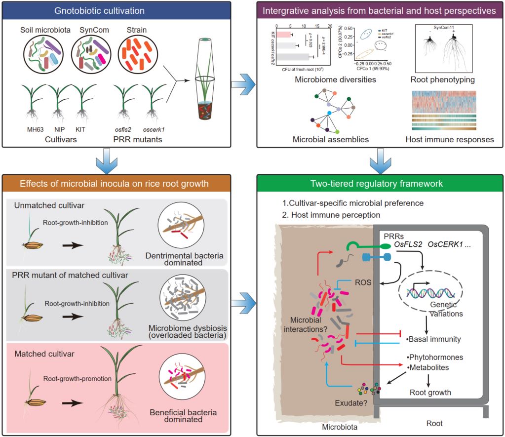 This study employed a tailored gnotobiotic cultivation system to investigate rice–microbiota interactions from both microbial and host perspectives. We found that the same bacterial inocula, including native soil microbiota, synthetic communities, and individual strains, exerted beneficial, neutral, or detrimental effects on rice root growth across cultivars. Our analysis suggests that a two-tiered regulatory framework, comprising cultivar-specific preference of the bacterial microbiota and host immune perception, governs the outcomes of rice–microbiota interactions.