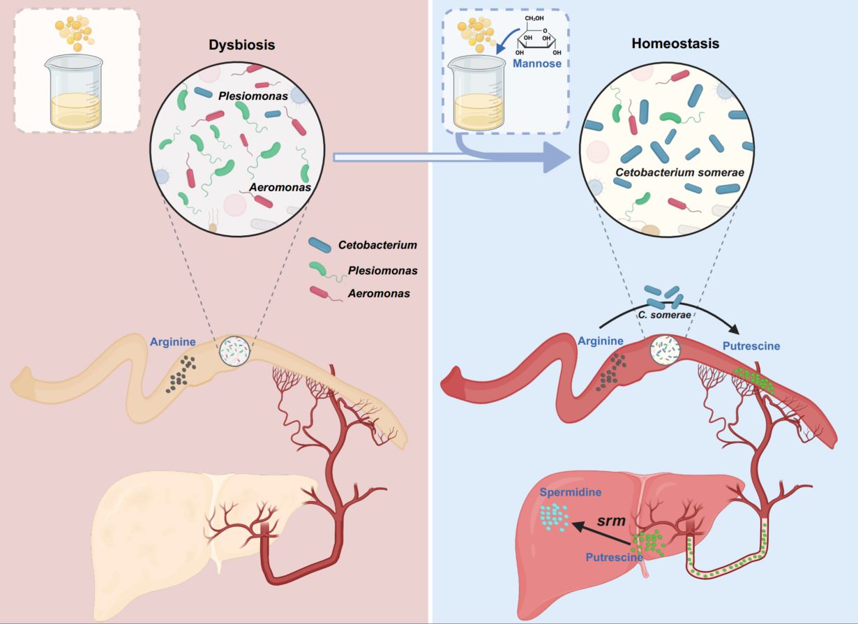 Evidence for liver metabolism of gut-derived microbial compounds into beneficial secondary metabolites has been lacking. Here, we demonstrate that Cetobacterium somerae (C. somerae), enriched by mannose supplementation under high-fat diet conditions, convert arginine into putrescine. The liver subsequently converts this microbial-derived putrescine to spermidine, which functions as an effector molecule to reduce hepatic lipid accumulation. These findings uncover a novel host-microbiota collaborative mechanism in which the arginine-putrescine-spermidine metabolic pathway is completed through inter-kingdom cooperation to ameliorate hepatic steatosis.