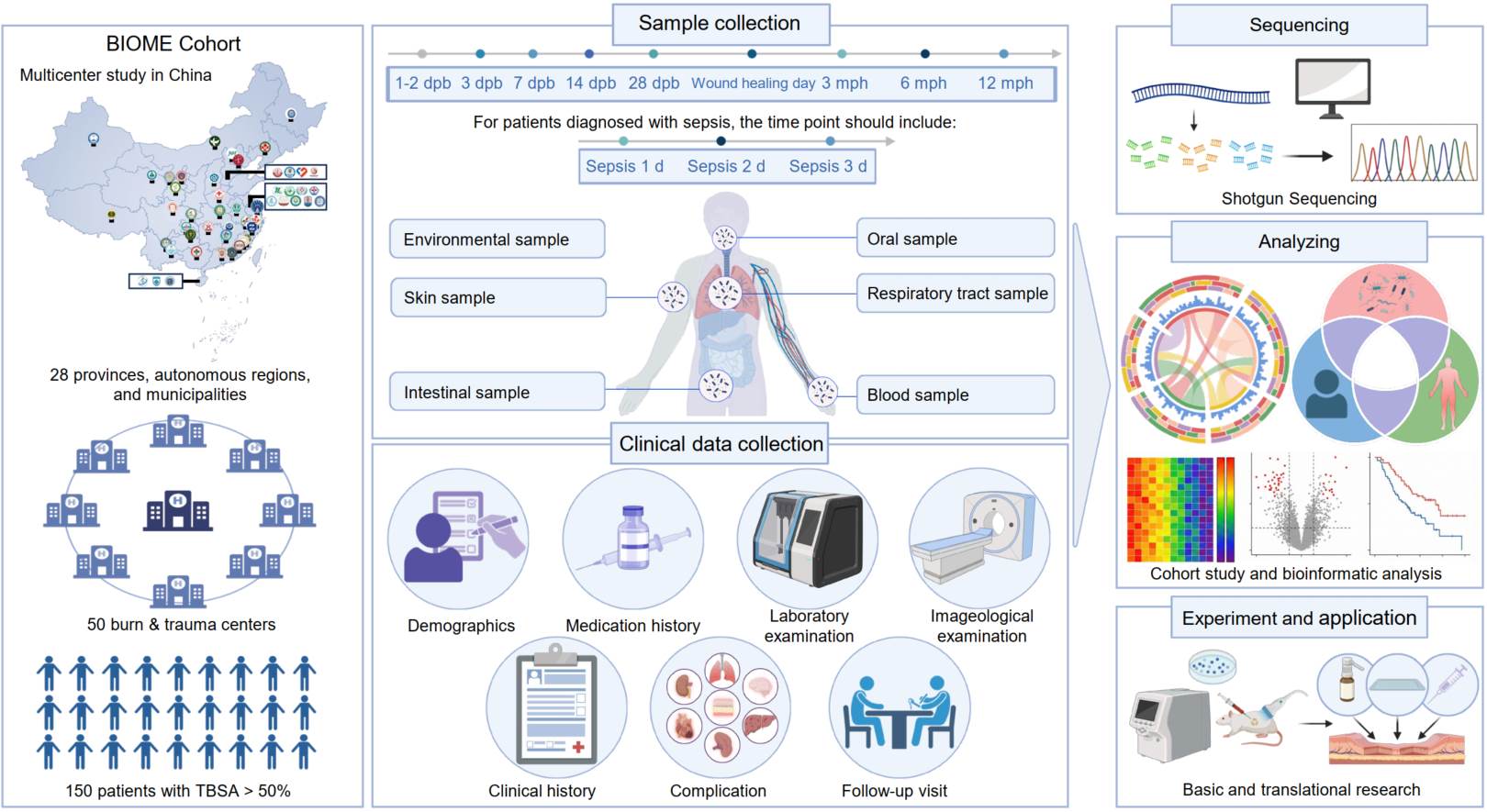 Massive burn injuries (MBIs) are associated with high mortality and disability rates, primarily due to microbial-driven sepsis from extensive skin barrier loss and subsequent scar formation. This makes MBI a compelling model for studying multi-system microbial dysbiosis following skin barrier destruction. We launched the Burn & Trauma Injury Organisms and Microbiome Ecology (BIOME) project, planning to enroll at least 150 MBI patients from 50 hospitals across 28 provinces, autonomous regions, and municipalities in China. The cohort includes skin swabs, intestinal and oral samples, and longitudinal clinical data collected from within 72 h post-injury through 1 year of follow-up. This multicenter, prospective, longitudinal cohort will establish a comprehensive clinical microbiota resource for patients with MBI. By integrating multi-system microbiome profiling with clinical outcomes, the BIOME project aims to elucidate the translational role of microbiota reconstruction as a potential target for diagnosis, prognosis, and therapeutic intervention in severe burn care.