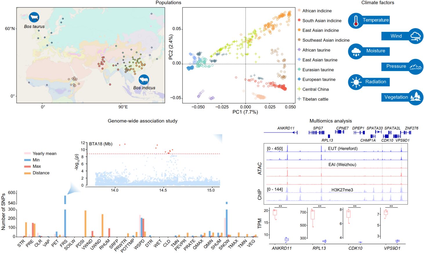 Climate adaptation genomics of cattle. We comparatively analyzed genomic data from 85 Old World cattle breeds/populations of Eurasia and Africa to identify genetic factors associated with climate factors. Environmental genome-wide association studies revealed 3165 single-nucleotide polymorphisms (SNPs) with strong correlations between climate factors and allele frequencies. We also identified loci that were significantly associated with temperature factors in the regulatory regions, such as promoter regions, of genes (ANKRD11, RPL13, CDK10, and VPS9D1) under strong selection pressure on Bos taurus autosome 18, which might regulate the expression of these genes. These significantly associated SNPs could be used as potential resources for marker-assisted breeding programs aimed at climate resilience and sustainable cattle production under changing environmental conditions.