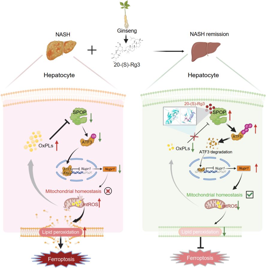 Schematic representation showing that 20 (S)-Rg3 improves mouse NASH. 20(S)-Rg3 reduces OxPLs levels and ameliorates ferroptosis in the liver of NASH mice. Mechanistically, 20(S)-Rg3 activates SPOP. Meanwhile, SPOP attenuates the ATF3-mediated transcriptional repression of NUPR1 by enhancing the K48-linked ubiquitination of ATF3. Upregulated NUPR1 rescues redox balance and reduces lipid peroxidation, ultimately inhibiting hepatocellular ferroptosis.